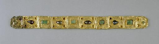 | Keywords: Byzantine - Diadem - Walters 57549.jpg Byzantine craftsmen revived the Hellenistic tradition of incorporating multicolored gemstones in jewelry which was not common during the Roman imperial period The ten sections of this openwork diadem were each adorned with a central gem and pearls now missing The diadem was sewn onto a headband of leather or cloth with holes so wearers could adjust the size Similar pieces were also worn as neckbands This example would most likely have been worn by members of the imperial family as its amethysts evoke the imperial color purple century 4 5 Late Antique gold amethyst emeralds cm 31 1 2 86 0 9 accession number 57 549 3439 Ernest Guilhou Paris by purchase Collection of Guilhou Sale Paris July 16-18 1905 no 272 Henry Walters city Baltimore Walters Art Museum Henry Walters Acquired by Henry Walters 1905 Objects of Adornment Five Thousand Years of Jewelry from the Walters Art Gallery Baltimore Cooper-Hewitt National Design Museum New York; Chrysler Museum of Art Norfolk; Carnegie Museum of Art Pittsburgh; San Antonio Museum of Art San Antonio; Philbrook Museum of Art Tulsa; Honolulu Academy of Arts Honolulu; New Orleans Museum of Art New Orleans; Milwaukee Art Museum Milwaukee; Minneapolis Institute of Arts Minneapolis; Toledo Museum of Art Toledo; The John and Mable Ringling Museum of Art Sarasota 1984-1987 Jewelry from the Walters Art Museum and the Zucker Family Collection The Walters Art Gallery Baltimore 1987 Bedazzled 5 000 Years of Jewelry from the Walters Art Museum Frist Center for the Visual Arts Nashville; The John and Mable Ringling Museum of Art Sarasota; The Walters Art Museum Baltimore 2006-2009 Heirs of the Empire in North Africa-The Kingdom of the Vandals Badisches Landesmuseum Karlsruhe Karlsruhe 2009-2010 Bedazzled 5 000 Years of Jewelry El Paso Museum of Art El Paso 2010 Early Christian and Byzantine Art Baltimore Museum of Art Baltimore 1947 Jewelry - Ancient to Modern The Walters Art Gallery Baltimore 1979-1980 place of origin Constantinople present-day Istanbul Turkey Walters Art Museum license Byzantine and Early Russian art in the Walters Art Museum Jewellery in the Walters Art Museum Byzantine diadems Media contributed by the Walters Art Museum needs category review |
