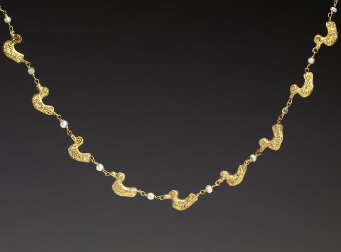 | Keywords: Byzantine - Necklace - Walters 571727 - Detail A.jpg Made for a middle-class woman this necklace is composed of simple toy-like ducks that appear to be solid gold yet are actually stamped out of thin foil This creates the false impression of a very costly necklace as do the glass beads that resemble pearls century 4 5 Late Antique gold and glass L 23 x W 3/4 x D 1/4 in 58 4 x 1 9 x 0 6 cm accession number 57 1727 38344 Said to have been found in Nazareth Robert Garrett Baltimore date of acquisition unknown by purchase Walters Art Museum October 11 1943 by gift Gift of Mr Robert Garrett 1943 Early Christian and Byzantine Art Baltimore Museum of Art Baltimore 1947 Jewelry - Ancient to Modern The Walters Art Gallery Baltimore 1979-1980 Beyond the Pharaohs Egypt and the Copts in the Second to Seventh Centuries A D Museum of Art Rhode Island School of Design Providence; The Walters Art Gallery Baltimore 1989 place of origin Naples Italy Walters Art Museum license Ancient Roman art in the Walters Art Museum Byzantine and Early Russian art in the Walters Art Museum Jewellery in the Walters Art Museum Byzantine necklaces |