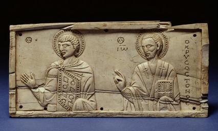 | Keywords: Byzantine - Unidentified Saint and Saint John Chrysostom - Walters 71291.jpg This rectangular plaque which may once have decorated the side of a box shows at the right St John Chrysostom d 407 archbishop of Constantinople and one of the great authorities of the Orthodox Church with his right hand raised in blessing The identity of the second saint remains uncertain although his clothes and especially his tunic clasped at the shoulder suggest that he was an early martyr century 10 Medieval ivory cm 8 16 5 1 accession number 71 291 37793 Léon Gruel Paris by purchase Henry Walters city Baltimore Walters Art Museum Henry Walters Acquired by Henry Walters 1923 Early Christian and Byzantine Art Baltimore Museum of Art Baltimore 1947 place of origin Constantinople present-day Istanbul Turkey Walters Art Museum license Byzantine ivory in the Walters Art Museum Decorative and applied arts of Byzantine Empire Media contributed by the Walters Art Museum needs category review |