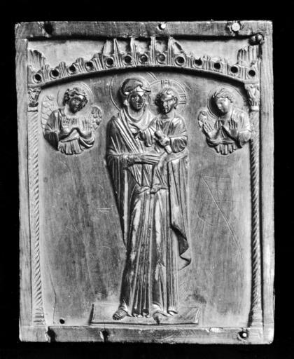 | Keywords: Byzantine - Virgin and Child with Two Angels - Walters 71293.jpg This ivory plaque formed the center panel of a devotional three-panel icon It shows the Virgin and Child under a canopy flanked by angels with their hands raised in adoration While the Christ Child blesses the viewer with his outstretched right hand the Virgin softly touches his leg a intimate gesture that stresses the close relationship between mother and son assuring the beholder of the power of the Virgin's intercessory prayers century 10 Medieval ivory cm 14 1 11 1 3 accession number 71 293 26847 Gaston Le Breton Rouen by purchase Sale Hotel Drouot Paris December 6-8 1921 no 194 Henri Daguerre Paris by purchase Henry Walters city Baltimore Walters Art Museum Henry Walters Acquired by Henry Walters 1923 Early Christian and Byzantine Art Baltimore Museum of Art Baltimore 1947 place of origin Constantinople present-day Istanbul Turkey Walters Art Museum license Byzantine ivory in the Walters Art Museum Decorative and applied arts of Byzantine Empire Media contributed by the Walters Art Museum needs category review Madonna and Child icon |