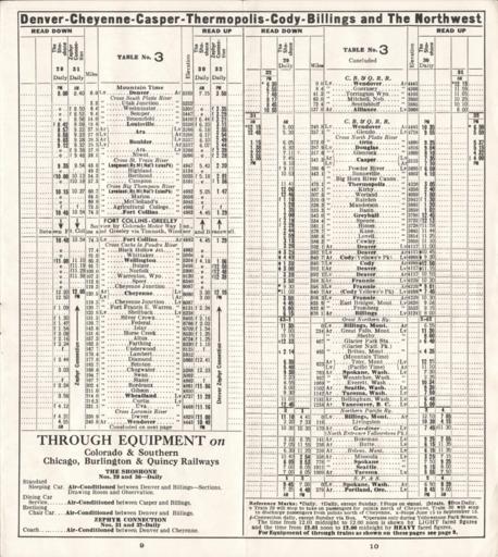 | Keywords: C&S46TTCO-1.png en 1946 Timetable of Colorado and Southern Railway trains numbers 29 and 30 The Shoshone 1946-06-09 http //streamlinermemories info/Zephyr/C S46TT pdf Chicago Burlington and Quincy Railroad other versions cc-zero Train timetables in the United States Colorado and Southern Railway |