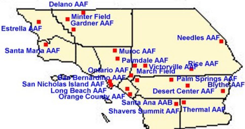 | Keywords: Ca-wwiiaflds-south.jpg Map of World War II Airfields in California Southern California 1940s self-made from PD basemap of California Counties 2008-04-17 Bwmoll3 Maps of the history of California World War II Military facilities in California United States Air Force bases Airports in California World War II California in the 1940s World War II home front in the United States California | ||||