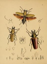 | Keywords: CabinetOrientalEntomology23.jpg en ORDER ”COLEOPTERA Section ”Longicorns Family ”Trictenotomidae Westw The first notice of the type of this very anomalous group of insects appeared in a note appended to a paper of mine in the I8-th number of the Zoological Journal published in 1S30 in which I regarded it as a connecting link between the Prionidae and Lucanidae agreeing with the former in its general appearance short trigonate advanced mandibles and moderately long antenna whilst in the internally produced structure of the three terminal joints of the antennae it agrees with Lucanus observing moreover that the joints of the tarsi are cylindric as in the latter but the insect is heteromerous Shortly afterwards a figure of the type Trictenotoma Childrenii was pubhshed from a drawiug of mine in the plates to Griffith's edition of the Animal Kingdom and M Guerin Meneville also gave a figure of it in his Magasin de Zoologie pi 35 with a notice by M Dupont in which the position of the genus was considered to be en tete des Longicornes famille on par tous ses rapports il entre tout naturellement During the period which has since elapsed no further attempt has been made to investigate the affinities of the genus by an examination of its structural characters Having however recently received a specimen of T Childrenii from Assam by the kindness of Major Jenkins and two other new and very distinct species having also been recently received in this country I have submitted the whole to a careful investigation the result of which is before the student in the accompanying plate From the considerations derived from the structure not only of the mouth organs but also the position of the wing veins and numerical arrangement of the abdominal segments I have no longer any hesitation in referring the insect to the section Longicornes notwithstanding the internally produced terminal joints of the antennae which is too trivial a character to be considered of high importance in limiting the groups the heteromerous tarsi and the structure of the organs of generation Moreover its nearest affinities appear to be the Prionidae especially in the poi-rected head and mandibles moderately short antennae slightly emarginate eyes and wing veins From these however it difi'ers in several respects so that I have considered it more natural to regard it as the type of a distinct family which may be thus characterised TRICTENOTOMIDAE Westw Head horizontal ; eyes transverse slightly emarginate behind the base of the antennae ; labrum short transverse; mandibles porrected nearly alike in both sexes Maxillae with the inner lobe scarcely produced outer lobe long narrow and haiiy ; mentum broad with the sides elevated ; labium short bipartite ; antennae moderately long ; those of the males rather more elongated ; three terminal joints internally serrated Pronotiun with the hind margin lobed in the middle ; wings folded at about threefourths of theii length from the base ; abdomen with seven dorsal and five ventral segments ; the terminal dorsal segment in the male notched ; the terminal ventral segment in the same sex more deeply I 2 notched ; the last dorsal segment of the female elongate-conic and notched ; the last ventral segment in the same sex entire ; ventral surface of the sheath of the male organs deeply notched ; the latter furnished with two long slender horny filaments ; sheath of the ovipositor of the female flattened and furnished with two slender hairy filaments; legs moderately long; all the tibice entire along the external margin and with two minute apical spurs ; tarsi sub-cylindric heteromerous the underside of each joint clothed with a short velvety pad ; body more or less clothed with a delicate pubescence The family consists at present of the single genus Trictenotoma of which I have now the pleasure to describe three species FIGURES I 2 ”Species 1 TRICTENOTOMA CHILDRENII G R Gray in Griflf An K pl 5 5 3 Trictenotoma nigra supra undique griseo-luteo pubescens mandibulis in utroque sexu subfalcatis antennis pedibus maculisque duabus elevatis prouoti nigris hujus lateribus sub-angulatis scutello triangiilari Trictenotoma blael; covered on the upper surface nitU luteous-grey pubescence the mandibles in both sexes subfalcate antennse legs and two elevated spots on the pronotum black ; the sides of the latter somewhat angulated ; and the scutellum triangular Length of the insect 11 to 2J inches Inhabits various pai-ts of India In the Collections of the British Museum Zoological Society Hope Pan-y Westwood c Figure 1 The female of the natural size; la the last ventral segment of the abdomen with the last dorsal segment extending beyond its extremity; lb Ic sheath of the ovipositor Figure 2a head of the male; 2b maxilla 1 cardo 2 stipes 3 mando 4 squama palpigera 5 galea 6 palpus 2c 2d 2e instrumenta labiaHa in different positions; 2 f under-side of abdomen of this sex; 2g under-side of sheath; 2h last dorsal segment of abdomen; 2i upper side of sheath; 2 k 21 inner sheath ; 2 m male organ; 2 n apex of ditto FIGURE 3 ”Species 2 TRICTENOTOMA TEMPLETONII Westw J Trictenotoma nigra supra luteo-albido pubescens mandibulis maris e vtus viilde sinuatis dente magno subapicali erecto armatis antennis pedibus maculisque duabus elevatis pronoti nigris hujus lateribus angulatis scutello triangulari Trictenotoma black above clothed «ith a luteous-buff pubescence the mandibles of the male outwardly much sinuated and ai-med near the apex with a large upright tooth ; the antenna; legs and two elevated spots on the pronotum shining black the sides of the latter angulated and the scutellum triangular Length of the insect nearly 2J inches Inhabits the island of Ceylon In the Collection of R Templeton Esq Figure 3 The male of the natural size; 3 a the last ventral segment of the abdomen showing the extremity of the last dorsal segment which is scarcely emarginate; 3 b the under-side of the sheath 3c male organ; 
