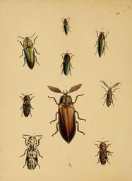 | Keywords: CabinetOrientalEntomology35.jpg en ORDER ”COLEOPTERA Section ”Pentamera Family ” Elateridae FIGURE I ”CAMPSOSTERNUS TEMPLETONII Westw Campsosternus viridi-aeneus ; pronoto lateribus marginatis cyaneis ante meJium jiarum Binuatis disco depresso cuprescenti carina media longitudinali elevata loete puiiiurca nitiJissima aiigulis posticis etiam purpureis eljlris subconvcxis postice magis cupreis sutura marginibuscjue latoralibus cyancscentibus disco sub Icnte granulosis striisque noTcm in singulo fere obliteratis ; corpore subtus cyaneo-purpurascenti lateribus tboracis et metasterni abdomineque magis cupreis antemiis pedibusque chalybseis Campsosternus brassy green ; the sides of the pronotum margined and cyaneous and slightly sinuated before the middle with a small excavation on each side beyond the middle the disk depressed and coppery having a rather raised longitudinal central carina of rich glossy purple the hind angles also purple ; the elytra rather convex rather more coppery beyond the middle the suture and lateral margins cyaneous the disk seen tlu'ough a lens is very finely granulose and each elytron has nine very fine stria; scarcely visible ; the body beneath is purple-cyaneous with the sides of the thorax and mesosternum and the abdomen more coppery ; the autennae and legs chalybeous Length of the insect 1 and 5/6 inch Inhabits Ceylon In the Collection of R Templeton Esq FIGURE 2 ”CAMPSOSTERNUS DOHRNII Westw Campsosternus feneus elytris magis auratis capite inter oculos bicanaliculato antennis brevioribus cyaneis ; pronoto convexo glaben-imo lateribus ante medium vi \ sinuatis rufo-purpureis disco ante marginem posticum bi-irapresso elytris glabris sub lente pimctis minutis impressis et ad basin sti-iis impressis notatis ; corpore subtus concolori pedibus nigro-aeneis Campsosternus brassy with the elytra more golden coloured ; the head is marked with two longitudinal impressions between the eyes ; the antennte rather short and cyaneous ; the pronotum convex and very glossy ; the sides before the middle are scarcely sinuated and are purplish-red ; the brassy disk has two impressions preceding the posterior margin ; the elytra are glossy and impressed with minute punctures visible only un der a lens ; the base is marked with several short deeper longitudinal strice ; the hody is coloured beneath as above ; the legs are brassy black Length of the insect nearly 1 inch Inhabits Assam Communicated by Major -Jenkins Named in honour of the President of the Entomological Society of Stettin FIGURE 3 ”CAMPSOSTERNUS STEPHENSII HOPE in Zool Journ p 25 Campsosternus postice valde acuminatus supra viridi-auratus Isevis capite punctate facie impressione ovali profunda pronoto impressionibus duabus obUquis prope medium mai-ginis postici lateribus integris vitta lata ferruginea margine ipso elevate teneo subtus aurato-aeneus nitidissimus prothoracis lateribus ferrugineo-rittatis pedibus aureo-asneis Campsosternus very much attenuated posteriorly above golden green smooth the head punctured the face with a deep oval impression ; the pronotum with the sides entii-e and with two oblique impressions near the middle of the posterior margin the sides with a broad femiginous baud the margin itself being elevated and brassy ; beneath brassy gold-coloured and very glossy ; sides of the prothorax broadly banded with ferruginous ; the legs brassy-golden Elytra deeply impressed at the base Length of the insect nearly I and 1/2 inch Inhabits Nepaul Gen Hardwicke In the Collection of the British Museum FIGURE 4 ”CAMPSOSTERNUS HOPEI Westw Campsosternus latus nitidissimus supra cyaneo-raidis elytris basi parum punctato-striatis ; capite nigro occipite eoncavo ; lateribus prothoracis pm-pureo late ˘ittatis mai-ginatis integris; corpore subtus cyaneo nitidissimo lateribus thoracis et abdominis purpureo-tinctis; pedibus cyaneis femoribus castaneo-ruiis Campsostemus broad convex and very glossy; above blue-green elytra at the base sUghtly punctate- striate the head black with the crown concave ; the sides of the prothorax broadly banded n-ith reddish-purple margined and entire ; body beneath cyaneous very glossy the sides of the thorax and abdomen tinged with purple ; legs cyaneous thighs chestnut-red Length of the insect 1 and 1/2 inch Inhabits Tennasserim In the British Museum FIGURE 5 ”OXYNOPTERUS CUMINGII Hope In Proc Zool Soc 1842 p 77 Oxynopterus fusco-nigricans capite et pronoto pubescentia brevl grisea indutis antennis ferrugineis capitis clypeo rotundato atro medio disci subsulcato ; prothorace fusco margmibus elevatis angulis anticis parum productisposticis acutis et extus divergentibus ; scutello postice rotundato atro ; elytris acuminatis fusco-flavis lineis tribus panira elevatis corpore infra atropiceo femoribus concoloribus mesosterno fortiter excavato cornu prosterni ad pedes medios extenso Foemina major antennis simplicibus Oxynopterus blaekish-bro\vii head and prothorax clothed with short grey pubescence antennEe ferraginous clypeus of the head rounded black ; the middle of the disc subsulcated ; prothorax bro\\'n with the lateral margins elevated the anterior angles somewhat produced the hind ones acute and extended outwardly the scutellum rounded behind and black the elyti-a acuminate at the tips fulvous-brown with three slightly elevated lines the body beneath pitchy-brown the thighs of the same colovir the mesosternum strongly excavated the prosternal spine extending to the middle feet The female is about a quarter of an inch larger and has simple antennce Length of the insect about 3 inches Inhabits the PhiUppine Islands Mr Cuming In the British Museum FIGURE 6 ”PECTOCERA MELLII Hope Op Cit p 79 Pectocera flavo-fusca griseo variegatus ; antennis pectinatis prothorace subtomentoso angulis posticis acutis elytris postice valde acuminatis ; pedibus flavo-fuscis et pubescentibus Pectocera yellowish-brown variegated with grey the antennae pectinated the pectinations n