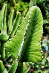 | Keywords: dsc01829 cactus ile de la réunion iledelaréunion la reunion island lareunionisland st gilles les bains stgilleslesbains jardin d'eden jardindeden 2013 sony nex-3 sonynex3 sel1855 974 euphorbia grandialata euphorbiagrandialata organic pattern pattern plant foliage leaf texture outdoor depth of field "A cactus (plural: cacti, cactuses, or cactus) is a member of the plant family Cactaceae, within the order Caryophyllales. The word "cactus" derives, through Latin, from the Ancient Greek κάκτος (kaktos), a name originally used for a spiny plant whose identity is not certain. Cacti are native to the Americas, ranging from Patagonia in the south to parts of western Canada in the north—except for Rhipsalis baccifera, which also grows in Africa and Sri Lanka. Most cacti live in habitats subject to at least some drought. Many live in extremely dry environments, even being found in the Atacama Desert, one of the driest places on earth. Cacti show many adaptations to conserve water. Most species of cacti have lost true leaves, retaining only spines, which are highly modified leaves. As well as defending against herbivores, spines help prevent water loss by reducing air flow close to the cactus and providing some shade. Cactus spines are produced from specialized structures called areoles, a kind of highly reduced branch. Areoles are an identifying feature of cacti. As well as spines, areoles give rise to flowers, which are usually tubular and multipetaled. In the absence of leaves, enlarged stems carry out photosynthesis. Unlike many other succulents, the stem is the only part of most cacti where this vital process takes place. Cactus stems also store water, and are often ribbed or fluted, which allows them to expand and contract easily. Cacti occur in a wide range of shapes and sizes. The tallest free-standing cactus is Pachycereus pringlei, with a maximum recorded height of 19.2 m (63 ft), and the smallest is Blossfeldia liliputiana, only about 1 cm (0.4 in) in diameter at maturity. The smaller cacti usually have globe-shaped stems, combining the highest possible volume with the lowest possible surface area. Many cacti have short growing seasons and long dormancies, and are able to react quickly to any rainfall, helped by an extensive but relatively shallow root system. A fully grown saguaro (Carnegiea gigantea) is said to be able to absorb as much as 200 US gallons (760 l; 170 imp gal) of water during a rainstorm. Like other succulent plants, most cacti employ a special mechanism called "crassulacean acid metabolism" (CAM) as part of photosynthesis. Transpiration, during which carbon dioxide enters the plant and water escapes, does not take place during the day at the same time as photosynthesis, but instead occurs at night. The plant stores the carbon dioxide it takes in as malic acid, retaining it until daylight returns, and only then using it in photosynthesis. Because transpiration takes place during the cooler, more humid night hours, water loss is significantly reduced. A few species differ significantly in appearance from most of the family. At least superficially, plants of the genus Pereskia resemble other trees and shrubs growing around them. They have persistent leaves, and when older, bark-covered stems. Their areoles identify them as cacti, and in spite of their appearance, they, too, have many adaptations for water conservation. Pereskia is considered close to the ancestral species from which all cacti evolved. In tropical regions, other cacti grow as forest climbers and epiphytes (plants that grow on trees). Their stems are typically flattened, almost leaf-like in appearance, with fewer or even no spines, such as the well-known Christmas cactus or Thanksgiving cactus (in the genus Schlumbergera). Cacti have a variety of uses: many species are used as ornamental plants, others are grown for fodder or forage, and others for food (particularly their fruit). Cochineal is the product of an insect that lives on some cacti. Source: Wikipedia "A cactus (plural: cacti, cactuses, or cactus) is a member of the plant family Cactaceae, within the order Caryophyllales. The word "cactus" derives, through Latin, from the Ancient Greek κάκτος (kaktos), a name originally used for a spiny plant whose identity is not certain. Cacti are native to the Americas, ranging from Patagonia in the south to parts of western Canada in the north—except for Rhipsalis baccifera, which also grows in Africa and Sri Lanka. Most cacti live in habitats subject to at least some drought. Many live in extremely dry environments, even being found in the Atacama Desert, one of the driest places on earth. Cacti show many adaptations to conserve water. Most species of cacti have lost true leaves, retaining only spines, which are highly modified leaves. As well as defending against herbivores, spines help prevent water loss by reducing air flow close to the cactus and providing some shade. Cactus spines are produced from specialized structures called areoles, a kind of highly reduced branch. Areoles are an identifying feature of cacti. As well as spines, areoles give rise to flowers, which are usually tubular and multipetaled. In the absence of leaves, enlarged stems carry out photosynthesis. Unlike many other succulents, the stem is the only part of most cacti where this vital process takes place. Cactus stems also store water, and are often ribbed or fluted, which allows them to expand and contract easily. Cacti occur in a wide range of shapes and sizes. The tallest free-standing cactus is Pachycereus pringlei, with a maximum recorded height of 19.2 m (63 ft), and the smallest is Blossfeldia liliputiana, only about 1 cm (0.4 in) in diameter at maturity. The smaller cacti usually have globe-shaped stems, combining the highest possible volume with the lowest possible surface area. Many cacti have short growing seasons and long dormancies, and are able to react quickly to any rainfall, helped by an 