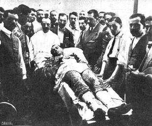 | Keywords: Cadáver de Corchaito.png es Fotografía que muestra el cadáver del matador de toros Corchaito en la enfermería de la plaza de toros de Cartagena poco después de fallecer tras ser corneado por un toro 1914-08-09 Mundo Gráfico número 147 de 19 de agosto de 1914 página 23 author other versions Custom license marker 2015 05 08 PD-old-80 1914 deaths 1914 events in Spain August 1914 in Spain 20th-century black and white photographs of Spain Bullfighters from Spain Cartagena Spain in the 20th century Human corpses in Spain Mundo Gráfico bullfighters People of Spain in 1914 Uploaded with UploadWizard |