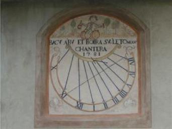 | Keywords: Cadran solaire. Hameau du Peuil.PNG Artwork LangSwitch Sundial on the facade of an old inn Cadran solaire sur la façade d'une ancienne auberge <br> LangSwitch Decor Décor LangSwitch Two lilies Deux fleurs de lys LangSwitch Bacchus drink on a barrel in one hand a pitcher and the other a tumbler He wears a wig and is of brocade jacket with breeches which stops at the knees followed by hoses Bacchus boit sur un tonneau un pichet d'une main et une timbale de l'autre Il porte une perruque en ailes de pigeon et revêt une veste de brocart avec une culotte qui s ™arrête aux genoux suivie de bas de chausse LangSwitch The ten strings of a lyre represent hours of the dial of the afternoon They join the soundboard bringing their numbers in Roman numerals The rod is T There is an equatorial line Les dix cordes d'une lyre représentent les heures de ce cadran déclinant de l'après-midi Elles joignent la table d'harmonie qui porte leurs numéros en chiffres romains Le style est en T Il existe une ligne équatoriale 1781 Technique mural place of discovery object history exhibition history credit line LangSwitch Motto Devise <br> LangSwitch Baccus drank and will drink and will sing on the barrel BACV A'BV ET BOIRA SU<small>R</small>'LE TO<small>NEAV</small> CHANTERA 1781 LangSwitch Restored by the workshop Tournesol in 2000 Restauré par l'atelier Tournesol en 2000 <br> LangSwitch See Voir <gallery>File Cadran solaire Lans-en-Vercors Peuil Notice explicative JPG Notice explicative Cadran solaire du Peuil </gallery> Société astronomique de France 3820501-1 Numéro d'identification de la Société astronomique de France S A F 3820501-1 Isère accession number place of creation Hameau du Peuil Lans en “Vercors Isère France cite web Balades en Isère Lans-en-Vercors https //baladesenisere wordpress com/tag/lans-en-vercors/ 2015 05 15 2015 09 06 fr PD-old-100 cite web Atelier Tournesol Cadrans restaurés 2000 Lans-en-Vercors ancienne auberge au hameau du Peuil Isère http //atelier tournesol free fr/ 11 2012 06 09 2015 fr cite web Gaëlle Yeretzian Anne Cayol-Gerin Département de l'Isère Patrimoine de l'Isère Bases de données Décors Lans-en-Vercors http //www isere-patrimoine fr/TP 20L_CODE/TPL_SITEPATRIMONIAL/PAR_TPL_IDENTIFIANT/119/1272-base htm 2015 09 10 fr Uploaded with UploadWizard Vertical sundials in France Sundials in Isère Lans-en-Vercors |