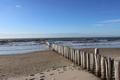 Keywords: cadzand-bad netherlands holland north sea beach summer july sky water landscape nature blue spacious holzbuhne breakwater distant traces