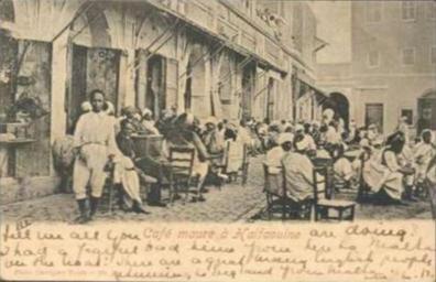 Keywords: Café maure à Halfaouine.jpg en Café maure in Halfaouine Tunis Tunisia Own collection author Early 1900s PD-Tunisia Cafés in Tunis People of Tunis Tunisia in the 1900s w Vintage postcards of Tunisia w