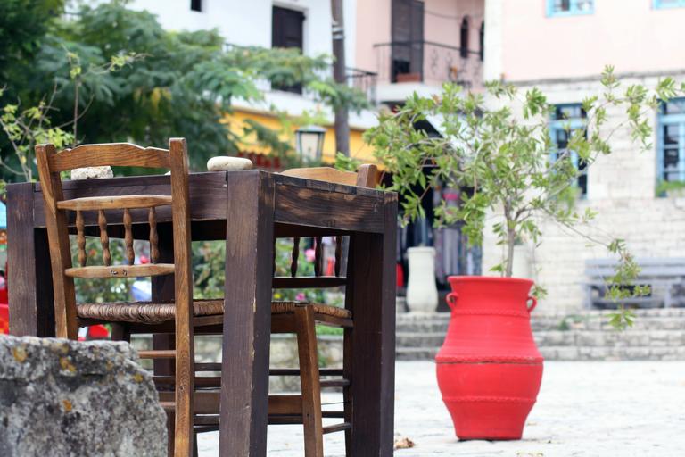 Keywords: cafe restaurant greece break travel blank wood table chair