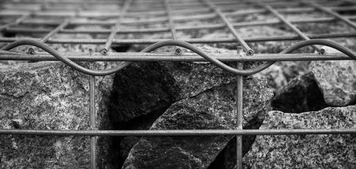 Keywords: cage stones grid black and white atmosphere architecture building street city macro close detail close up cable fence metal iron outdoor outside the safety of the steel irons grating structure metal construction grate
