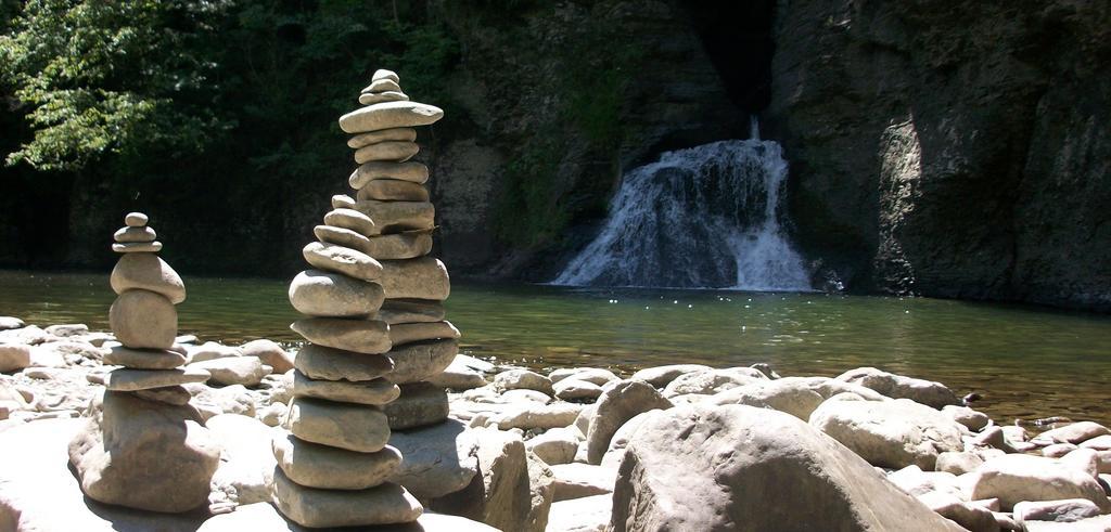 Keywords: cairn balance zen stacked stones rocks waterfall nature pond outdoors tranquil peace