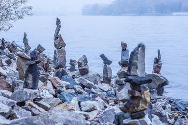 Keywords: cairn stones stone tower pile tower cairn art artwork water coast mood nature fog rhine river weather mood still life atmosphere landscape bank shore stone