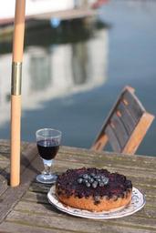 Keywords: cake pastry blue berries berries blue water summer upside down cake wine sugar candy powdered sugar reflection chair terrace chairs peaceful sun dream holiday garden pond river houseboat light parasol grape juice drink bourgondisch
