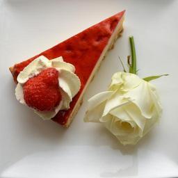 Keywords: cake slice toppings strawberry rose white sweet delicious pastry baked treat icing food flower