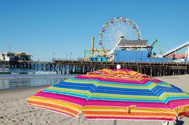 Keywords: california beach parasol umbrella ferris wheel pier coast ocean sea summer vacation travel sky water blue relax tourism sand colorful colors santa monica