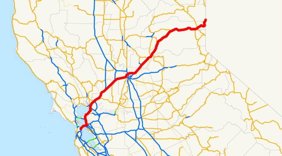 | Keywords: California Interstate 80.svg Interstate 80 in California The Interstate runs from the Bay Bridge in San Francisco California San Francisco east through Sacramento California Sacramento and over the Sierra Nevada to the Nevada border en route to Reno Nevada Email me if you would like a copy of the GIS data I created for the highways NE2 Sources http //www bts gov/publications/north_american_transportation_atlas_data/ BTS North American Transportation Atlas Data http //www dot ca gov/hq/traffops/trucks/truckmap/truck-route-list xls Caltrans State Truck Route List XLS file http //www dot ca gov/hq/structur/strmaint/brlog2 htm Caltrans Log of Bridges on State Highways http //traffic-counts dot ca gov/ All Caltrans Traffic Volumes on CSHS http //www leginfo ca gov/cgi-bin/displaycode section shc group 00001-01000 file 300-635 California State Legislature Definitions of Routes Interstate 80 in California Road maps of state highways in California 080 Transport in San Francisco Transport in Alameda County California Transport in Contra Costa County California Transport in Solano County California Maps of Napa County California Maps of Yolo County California Maps of Sacramento County California Transport in Sacramento Maps of Placer County California Maps of Nevada County California |