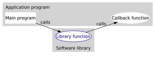 | Keywords: Callback-notitle.svg This simple diagram made with Graphviz shows a callback function including the application main program a software library function and the callback function own 2006-04-20 TuukkaH Other fields Graphviz 2 + text Command line <callback dot dot -Tsvg ”ƒ sed -e 's/<title> <\/title>//' >callback-notitle svg dot Graphiz code digraph Pipeline rankdir LR labeljust l style filled color lightgrey node style filled fillcolor white color white subgraph clusterApplication label Application program program label Main program shape rect callback label Callback function invisible content to match layout with intention edge style invis node style invis label width 0 01 height 0 01 program -> libpad libpad -> callback subgraph clusterLibrary margin 5 5 label Software library labelloc b node color blue fontcolor blue function label Library function program -> function label calls function -> callback label calls Computer science flowcharts SVG flow charts Images with Graphviz source code |