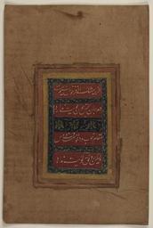 | Keywords: Calligraphic fragment in nasta'liq.jpg en Calligraphic fragment executed in nasta'liq script in white ink on red background It includes four lines of Persian poetry describing the heavenly scent and life-endowing capabilities of the beloved The verses read Agar cha mushk-i az far khush nasim ast / Dam-i jan bakhsh chun buyat nadarad / Maqam-i khub u dilkhwah-st firdaws / Valikin runaq-i kuyat nadarad Although musk smells fragrant / It does not breathe life like your scent / Paradise is a good and beloved place / But it is not as splendid as your abode Blue panels decorated with gold flower and leaf motifs separate and frame the lines of text The dimensions of the written surface are 8 w x 14 h cm http //memory loc gov/cgi-bin/ampage collId ascs fileName 050/ascs050 db recNum 0 itemLink D ascsbib 260 /temp/~intldl_eEP1 Library of Congress Selections of Arabic Persian and Ottoman Calligraphy century 18 Munshi Ram attr PD-Art Nastaliq Library of Congress Arabic Persian and Ottoman calligraphy collection Poems in Persian Persian manuscripts Persian calligraphy |