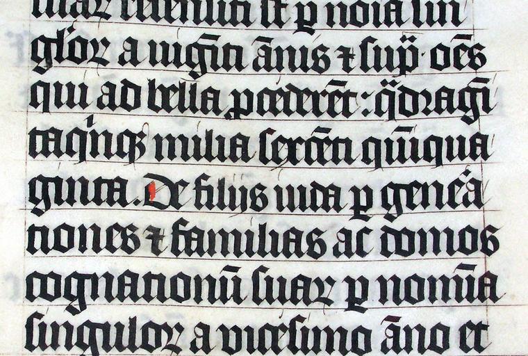 Keywords: Calligraphy.malmesbury.bible.arp.jpg Calligraphy in a Latin Bible of AD 1407 on display in Malmesbury Abbey Wiltshire England The Bible was hand written in Belgium by Gerard Brils for reading aloud in a monastery <br> The text on display is Latin and it comes from the book of Numbers Num 1 24-26 The text is including the first line which is not entirely visible suarum recensiti sunt per nomina sin<br>gulorum a viginti annis et supra omnes<br> qui ad bella procederent 25 quadragin<br>ta quinque milia sexcenti quinqua<br>ginta 26 De filiis Iuda per genera<br>tiones et familias ac domos<br> cognationum suarum per nomina<br>singulorum a vicesimo anno et <small>of their fathers according to the number of the names from twenty years old and upward all that were able to go forth to war; 25 Those that were numbered of them even of the tribe of Gad were forty and five thousand six hundred and fifty 26 Of the children of Judah by their generations after their families by the house of their fathers according to the number of the names from twenty years old and</small> It is interesting to note the scribal abbrevations which are used thoroughly such as the symbol for -rum see the end of the first word on the second line and the use of bars over vowels to indicate a missing n viginti annus second line again and of course the symbol for et although it is written in full near the end of the text Other abbrevations include the modified 'p' for 'per' and the use of dots above characters to indicate missing letters sup with dots instead of supra 2005-02 own Adrian Pingstone Arpingstone Calligraphy 1407 texts Taken with Olympus C-750UZ Old Testament Bible manuscripts Book of Numbers Textura Malmesbury bible |