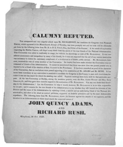 | Keywords: Calumy Refuted.jpg en Photograph of work entitled Calumny Refuted the unexpected and very singular attack upon Mr Richardson the candidate for Congress from Plymouth District which appeared in the Massachusetts Journal on Tuesday has been promptly met and we trust will be effectually put down by the following letter from Mr R to D L Child Esq the Editor of the Journal Work mentions John Quincy Adams Richard Rush and Joseph Richardson Printed at Hingham Massachusetts The Library of Congress Washington D C http //memory loc gov/rbc/rbpe/rbpe05/rbpe054/05401400/001dr jpg Author 1828 History of Massachusetts John Quincy Adams PD-USGov |