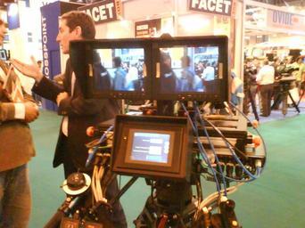 Keywords: Cámara de TV en 3D.JPG es Cámara de TV en 3D con las cámara individuales dispuestas en horizontal vista de trasera own Txo 2009-11 Video cameras 3D Television