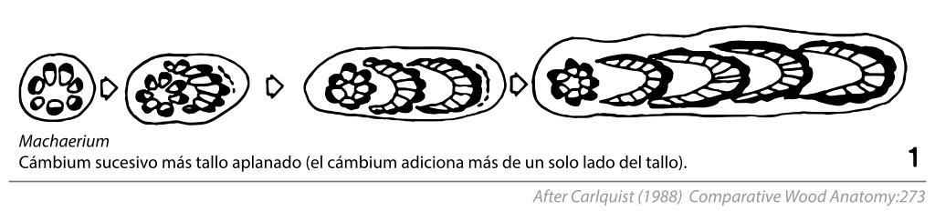 | Keywords: Cambial Variants (Anomalous Secondary Growth) Fig. 8.7.1 Machaerium (in Spanish).svg en Fig 8 7 Stems fo lianas that show a combination of cambial variants machaerium combines flattened stems with succesive cambia Mendoncia has interxylary phloem plus fragmentation of the cambium into segments Thinouia has a kind of succesive cambial activity origin of strands of vascular tissue in cortex plus lobed stems in Fig 8 4 Conventions for this and other figures in this chapter black phloem blank with circles indicating vessels xylem; stippled axial parenchyma vertical or variously diagonal lines in pairs rays 1988-01-01 S Carlquist 1988 p 273 Fig 8 7 Chapter 8 Cambial Variants Anomalous Secondary Growth In Comparative Wood Anatomy Part of the series Springer Series in Wood Science Springer Verlag Berlin Heidelberg S Carlquist 1988 other versions Custom license marker 2016 05 08 Tracing data from a scientific diagram taken from primary scientific literature not the scope of copyright laws PD-ineligible Equivalent to cc-0 Wood anatomy Machaerium |