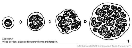 | Keywords: Cambial Variants (Anomalous Secondary Growth) Fig. 8.6.1 Flabellaria.svg en Fig 8 6 Cambial variants in which the cambium is or becomes separated into several segments Four stages in development are shown for each species Flabellaria has origin of xylem segments outside the original cylinder; these segments are expanded and dispersed by parenchyma proliferation Serjania corrugata has a xylem cylinder consisting of arcs in sectional view ; the arcs are converted to cylinders Serjania fuscifolia has cortical bundles; xylem is added to each of these and to the original cylinder in Fig 8 4 Conventions for this and other figures in this chapter black phloem blank with circles indicating vessels xylem; stippled axial parenchyma vertical or variously diagonal lines in pairs rays 1988-01-01 S Carlquist 1988 p 271 Fig 8 6 Chapter 8 Cambial Variants Anomalous Secondary Growth In Comparative Wood Anatomy Part of the series Springer Series in Wood Science Springer Verlag Berlin Heidelberg S Carlquist 1988 other versions Custom license marker 2016 05 08 Tracing data from a scientific diagram taken from primary scientific literature not the scope of copyright laws PD-ineligible Equivalent to cc-0 Wood anatomy Flabellaria |