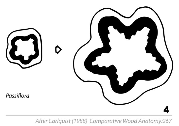| Keywords: Cambial Variants (Anomalous Secondary Growth) Fig. 8.5.4 Passiflora.svg  en Fig 8 5 Diagrammatic representations showing ontogenetic sequences in cambia that have normal products phloem to outside xylem to inside but abnormal conformation Cambium produces more xylem in some places than others to achieve flattened or lobed stems Grooved xylem results from cambium that acts unilaterally little or no xylem in grooves Phaedranthus ; progressively unilateral activity may expand along margins of grooves resulting in ledged zig-zag appearance Passiflora Presence of xylem plates separated by rays results from sluggish cambial activity in ray areas in Fig 8 4 Conventions for this and other figures in this chapter black phloem blank with circles indicating vessels xylem; stippled axial parenchyma vertical or variously diagonal lines in pairs rays 1988-01-01 S Carlquist 1988 p 267 Fig 8 5 Chapter 8 Cambial Variants Anomalous Secondary Growth In Comparative Wood Anatomy Part of the series Springer Series in Wood Science Springer Verlag Berlin Heidelberg S Carlquist 1988 other versions Custom license marker 2016 05 08 Tracing data from a scientific diagram taken from primary scientific literature not the scope of copyright laws PD-ineligible Equivalent to cc-0 Wood anatomy Passiflora |