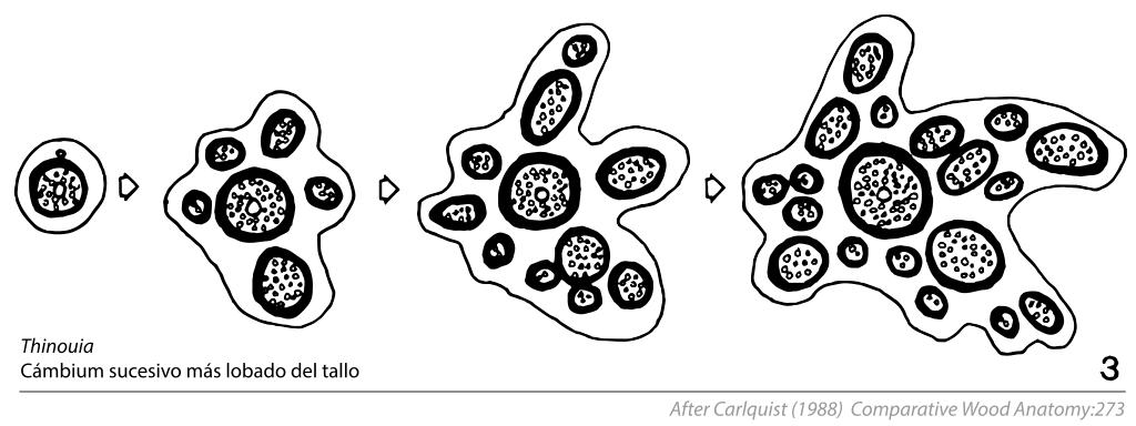 | Keywords: Cambial Variants (Anomalous Secondary Growth) Fig. 8.7.3 Thinouia (in Spanish).svg en Fig 8 7 Stems fo lianas that show a combination of cambial variants machaerium combines flattened stems with succesive cambia Mendoncia has interxylary phloem plus fragmentation of the cambium into segments Thinouia has a kind of succesive cambial activity origin of strands of vascular tissue in cortex plus lobed stems in Fig 8 4 Conventions for this and other figures in this chapter black phloem blank with circles indicating vessels xylem; stippled axial parenchyma vertical or variously diagonal lines in pairs rays 1988-01-01 S Carlquist 1988 p 273 Fig 8 7 Chapter 8 Cambial Variants Anomalous Secondary Growth In Comparative Wood Anatomy Part of the series Springer Series in Wood Science Springer Verlag Berlin Heidelberg S Carlquist 1988 other versions Custom license marker 2016 05 08 Tracing data from a scientific diagram taken from primary scientific literature not the scope of copyright laws PD-ineligible Equivalent to cc-0 Wood anatomy Thinouia |