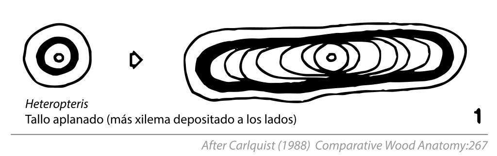 | Keywords: Cambial Variants (Anomalous Secondary Growth) Fig. 8.5.1 Heteropteris.svg  en Fig 8 5 Diagrammatic representations showing ontogenetic sequences in cambia that have normal products phloem to outside xylem to inside but abnormal conformation Cambium produces more xylem in some places than others to achieve flattened or lobed stems Grooved xylem results from cambium that acts unilaterally little or no xylem in grooves Phaedranthus ; progressively unilateral activity may expand along margins of grooves resulting in ledged zig-zag appearance Passiflora Presence of xylem plates separated by rays results from sluggish cambial activity in ray areas in Fig 8 4 Conventions for this and other figures in this chapter black phloem blank with circles indicating vessels xylem; stippled axial parenchyma vertical or variously diagonal lines in pairs rays 1988-01-01 S Carlquist 1988 p 267 Fig 8 5 Chapter 8 Cambial Variants Anomalous Secondary Growth In Comparative Wood Anatomy Part of the series Springer Series in Wood Science Springer Verlag Berlin Heidelberg S Carlquist 1988 other versions Custom license marker 2016 05 08 Tracing data from a scientific diagram taken from primary scientific literature not the scope of copyright laws PD-ineligible Equivalent to cc-0 Wood anatomy Heteropteris |