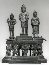 | Keywords: Cambodian - Pedestal with Deities - Walters 542715.jpg This interesting object is an amalgamation but an amalgamation of long standing The oldest part is the lower base with lion supports This was originally the lowermost part of an altarpiece The two main figures Shiva and Lakshmi wear garments with attached floral medallions Siva holds a trident in his left hand and a rosary in his right Lakshmi holds two lotuses The third element is the Vishnu at left Physical evidence indicates that it was added to the ensemble in recent times Base 1101-1150; Right figures 1180-1220; Left figure 12th-13th century Khmer; Right figures Bàyon solid cast bronze leaded bronze cm 22 5 15 5 accession number 54 2715 16860 Thailand Alexander B Griswold Monkton probably 1949 presented to the Breezewood Foundation November 7 1956 inv no 409 Walters Art Museum Henry Walters Bequest of A B Griswold 1992 none Unearthly Elegance Buddhist Art from the Griswold Collection The Walters Art Gallery Baltimore 1995 place of origin Angkor present-day Siem Reap Cambodia Walters Art Museum license Southeast Asian art in the Walters Art Museum Sculptures from Cambodia Media contributed by the Walters Art Museum needs category review Media contributed by the Walters Art Museum needs artist review |