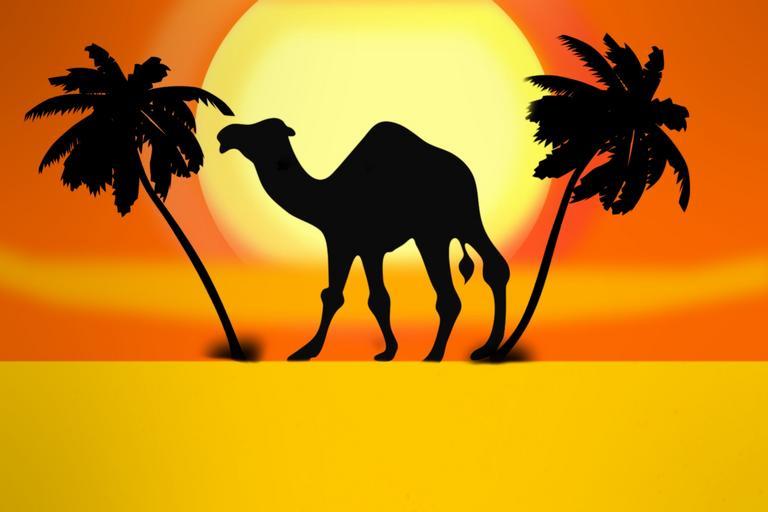 Keywords: camel palm desert sun sunrise oasis sahara orange yellow graphic summer holiday watering hole libya