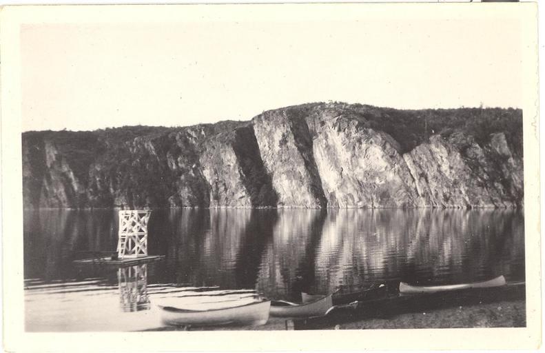 | Keywords: bon echo bonecho mazinaw mazinaw rock mazinawrock cloyne ontario canada leavens brothers leavensbrothers merrill denison merrilldenison provincial park provincialpark 1932 flora macdonald denison floramacdonalddenison trinity college trinitycollege boy's camp boyscamp diving tower divingtower The Mazinaw Rock during the time of the first Mazinaw Boys Camp, between 1929 and approximately 1934. Mazinaw Rock (sometimes erroniously, called Bon Echo Rock) is a high rock cliff rising just shy of 300 feet out of Mazinaw Lake. The cliff also extends approximately the same depth below the waterline, with a huge tallus pile where rock shards have broken away from the cliff face over the millenia. It is located 16 km north of Cloyne, Ontario, Canada and is now incorporated within Bon Echo Provincial Park. Bon Echo Provincial Park was officially opened in 1965 when Merrill Denison donated the property to the Province of Ontario for the creation of a provincial park. Merrill Denison inherited the property and the Bon Echo Inn from his mother Flora MacDonald Denison. In the time period of this photo (1930-34) the property was being leased to Trinity College in Port Hope Ontario, which operated a boy's camp. After the boys camp closed, the Leavens Brothers operated the Inn as a summer hotel. In 1936 the Inn and some of the outbuildings were destroyed in a fire started by lightning striking the bakehouse. The loss was not fully insured and the Inn was never rebuilt. The Mazinaw Rock during the time of the first Mazinaw Boys Camp, between 1929 and approximately 1934. Mazinaw Rock (sometimes erroniously, called Bon Echo Rock) is a high rock cliff rising just shy of 300 feet out of Mazinaw Lake. The cliff also extends approximately the same depth below the waterline, with a huge tallus pile where rock shards have broken away from the cliff face over the millenia. It is located 16 km north of Cloyne, Ontario, Canada and is now incorporated within Bon Echo Provincial Park. Bon Echo Provincial Park was officially opened in 1965 when Merrill Denison donated the property to the Province of Ontario for the creation of a provincial park. Merrill Denison inherited the property and the Bon Echo Inn from his mother Flora MacDonald Denison. In the time period of this photo (1930-34) the property was being leased to Trinity College in Port Hope Ontario, which operated a boy's camp. After the boys camp closed, the Leavens Brothers operated the Inn as a summer hotel. In 1936 the Inn and some of the outbuildings were destroyed in a fire started by lightning striking the bakehouse. The loss was not fully insured and the Inn was never rebuilt. |