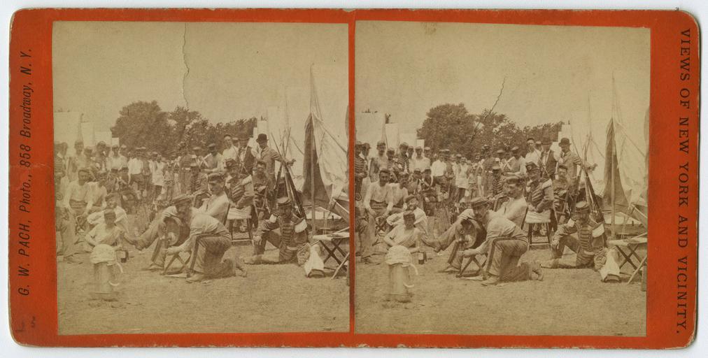 | Keywords: library company of philadelphia librarycompanyofphiladelphia stereographs philadelphia centennial exhibition centennialexhibition camp washington campwashington g.w. pach gwpach Shows West Point Cadets gathered in front of tents at Camp Washington in Fairmount Park, Philadelphia, Pa at the Centennial Exhibition of 1876. The men are fully and partially uniformed and some are armed. In the foreground is a man pouring a drink from a barrel spigot.  Accession number: P.2011.47.594 Shows West Point Cadets gathered in front of tents at Camp Washington in Fairmount Park, Philadelphia, Pa at the Centennial Exhibition of 1876. The men are fully and partially uniformed and some are armed. In the foreground is a man pouring a drink from a barrel spigot.  Accession number: P.2011.47.594  |