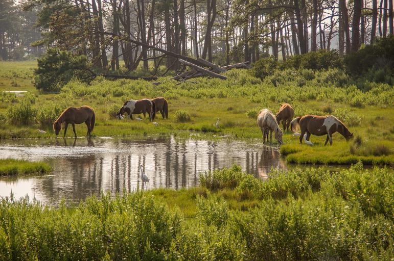 Keywords: nature public domain publicdomain landscape scenic serene horse horses pony ponies marsh water woods green free outdoor field grassland Chincoteague, VA, USA Chincoteague, VA, USA