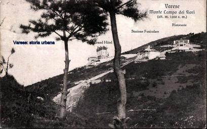 | Keywords: Il complesso turistico del Campo dei Fiori appena completato. Al centro il Grand Hotel (terminato nel 1912) a destra la stazione a monte della funicolare e il Ristorante Campo dei Fiori (entrambe completate nel 1911). Tutte e tre le opere sono state progettate dall'arch. Giuseppe Sommaruga tra il 1908 e il 1910. In alto le tre croci e i versanti della montagna completamente privi di copertura vegetale. varese funicolare campodeifiori | ||||