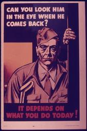 | Keywords: "Can You Look Him in the Eye When He Comes Back^ It Depends on What You do Today" - NARA - 514638.jpg Scope and content General notes 514638 Local identifier 44-PA-1111 Office for Emergency Management Office of War Information Domestic Operations Branch Bureau of Special Services 03/09/1943 - 09/15/1945 NARA-Author Packer poster artist Artist 8467744 <br /> Still Picture Records Section Special Media Archives Services Division NWCS-S National Archives at College Park 8601 Adelphi Road College Park MD 20740-6001 1941 - 1945 Record group Record Group 44 Records of the Office of Government Reports 1932 - 1947 Record group ARC 373 World War II Posters compiled 1942 - 1945 Series ARC 513498 File unit File unit ARC Variant control numbers NAIL Control Number NWDNS-44-PA-1111 Other versions <gallery> File Can_You_Look_Him_in_the_Eye_When_He_Comes_Back _It_Depends_on_What_You_do_Today _-_NARA_-_514638 tif tif File Can_You_Look_Him_in_the_Eye_When_He_Comes_Back _It_Depends_on_What_You_do_Today _-_NARA_-_514638 jpg jpg </gallery> NARA-cooperation PD-USGov World War II posters from the United States |