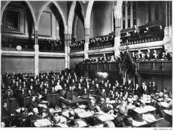 | Keywords: Canada House Commons QE1 16.jpg The House of Commons of Canada in session circa 1899 in Ottawa Ontario Canada This photograph shows the original chamber of the House of Commons of Canada 1859-1916 destroyed in the Parliament Hill fire of 1916 <p> Original caption The Canadian House of Commons in Session Next to the Imperial Parliament at Westminster the Dominion Parliament at Ottawa is undoubtedly the most dignified and important Legislative Assembly in the British Empire We have here a representation of the Canadian House of Commons in Session in the position of the Speaker in the procedure in debate and in the arrangement of parties on the two sides of the House British precedents are closely followed The arrangement of seats in an assembly may seem a matter of slight importance but there can be no doubt that the sharp distinction into two sides has gone far to prevent the creation of the many small parties which almost inevitably spring up in a semicircular Chamber where the extreme right the right the right centre the left centre and so on are all recognisable divisions The Queen's Empire Volume 1 Cassell Co London 1899 Cassell Co PD-Canada PD-old-70-1923 The Queen's Empire book Original Chamber of the House of Commons of Canada 1859-1916 1899 in politics of Canada 1899 in Ottawa |