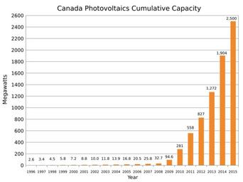 | Keywords: Canada Photovoltaics Installed Capacity.svg translate yes en Installed photovoltaics in Canada from 1996 to 2014 Source http //www iea-pvps org/index php id 92 eID dam_frontend_push docID 2795 IEA-PVPS 2016-03-11 own Delphi234 other versions cc-zero Solar energy in Canada Photovoltaic power statistics |