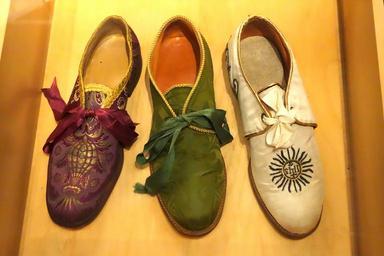 | Keywords: Canadian priest shoes, purple worn by Most Reverend Francis Morocco during Lent, others worn by M.R. B.I. Webster, (white on holy days, green ordinary), 1964-1975, Peterborough, Ontario - Bata Shoe Museum - DSC00154.JPG en Exhibit in the Bata Shoe Museum Toronto Ontario Canada The museum permitted photography without restriction 2013-07-04 10 26 16 own Daderot cc-zero Uploaded with UploadWizard Shoes in the Bata Shoe Museum | ||||