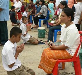 | Keywords: Candidate for the Buddhist novice in the Buddhist religion priesthood 02.jpg a candidate for the Buddhist priesthood is payying respect to his mother own 2007 Ordination at Wat Khung Taphao Buddhist child monks ordination of Thailand Buddhist traditions in Wat Khung Taphao |