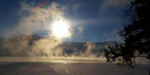 Keywords: canim lake winter early morning sun fog scenery landscape nature british columbia canada