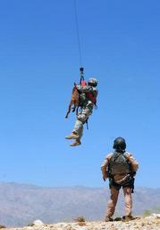 | Keywords: Canines Take Part in Aviation Training DVIDS50013.jpg en Staff Sgt Michael Hile left with Ronnie his military working dog from 554th Military Police Company lifting off the ground by a hoist lowered from a UH-60 Black Hawk helicopter July 16 during a canine-hoist training mission First Sgt Dean Bissey Company C MEDEVAC company 3rd General Support Aviation Battalion 82nd Combat Aviation Brigade stands underneath the hoisted canine team to confirm the security of the harness 2007-07-15 Sgt Aubree Rundle https //www dvidshub net/image/50013 50013 2007-07-17 15 47 BAGRAM AIR FIELD AF PD-USGov Bagram Air Base UH-60 Black Hawk Images from DoD uploaded by Fæ 82nd Aviation Brigade United States |