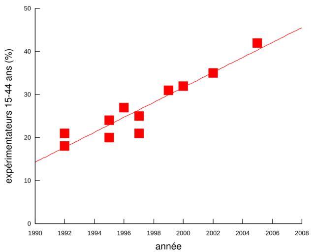 | Keywords: Cannabis-France-experimentation.svg Expérimentation du cannabis en France chez les 15-44 ans dans les années 1990 et 2000 données de sondages points et régression linéaire de l'évolution temporelle Self-made by uploader from data displayed in Jean-Michel Costes ed Cannabis données essentielles Observatoire français des drogues et des toxicomanies Saint-Denis 2007 ISBN 978-2-11-096697-1 2008-06-19 User Brachycerophilia Cannabis in France Linear regression Cannabis-related graphics | ||||