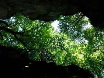 Keywords: canopy trees green foliage upward rock cleft rock sheep mountain gorge swabian alb zollernalb alb eaves hike more alb hike excursion day destination swabian alb nordrand route