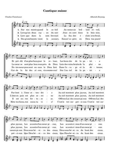 | Keywords: Cantique Suisse.png en The Swiss national anthem with the French lyrics Own Music by Alberich Zwyssig 1808-1854 ; French lyrics by Charles Chatelanat 1833-1907 ; music sheet by User Schutz 1841 The music and the lyrics are in the public domain Cantique Suisse svg LilyPond source <pre> \header composer Alberich Zwyssig title Cantique suisse subtitle poet Charles Chatelanat \paper set-paper-size a4 top-margin 0\cm set-global-staff-size 18 \relative \time 3/4 \new ChoirStaff << \new Staff << \key bes \major \new Voice main \key bes \major \tempo 4 72 f8 f16 f4 bes bes8 a16 a2 f8 f16 f4 c' c8 bes16 bes2 d4 d8 c8 c8 c4 bes8 a4 g2 e4 f2 r4 a8 a16 a4 a bes4 a8 g f f2 \noBreak f2 r4 a8 a16 a4 a bes4 c8 d4 c2 bes4 a2 r4 f8 f16 f4 bes aes8 g16 g2 g8 g16 g4 c4 bes8 a16 a2 d4 d8 ees c bes2 a4 bes2 c4 d4 d8 ees c bes2 bes4 bes a8 g a4 bes2 >> \new Lyrics \lyricsto main \set stanza 1 Sur nos monts quand le so -- leil An -- nonce un bril -- lant ré -- veil Et pré -- dit d'un plus beau jour le re -- tour Les beau -- tés de la pa -- tri -- e Par -- lent à l'âme at -- ten -- dri -- e Au ciel mon -- tent plus joy -- eux Au ciel mon -- tent plus joy -- eux Les ac -- cents d'un coeur pi -- eux Les ac -- cents é -- mus d'un coeur pi -- eux \new Lyrics \lyricsto main \set stanza 2 Lors -- qu'un doux ray -- on du soir Joue en -- core dans le bois noir Le coeur se sent plus heu -- reux près de Dieu Loin des vains bruits de la plai -- ne L'âme en paix est plus se -- rei -- ne Au ciel mon -- tent plus joy -- eux Au ciel mon -- tent plus joy -- eux Les ac -- cents d'un coeur pi -- eux Les ac -- cents é -- mus d'un coeur pi -- eux \new Lyrics \lyricsto main \set stanza 3 Lors -- que dans la som -- bre nuit La fou -- dre é -- clate avec bruit No -- tre coeur pres -- sent en -- core le Dieu fort Dans l'o -- ra -- ge et la dé -- tresse Il est no -- tre for -- te -- re -- se Of -- frons Lui des coeurs pi -- eux Of -- frons Lui des coeurs pi -- eux Dieu nous bé -- ni -- ra des cieux Dieu nous bé -- ni -- ra du haut des cieux \new Lyrics \lyricsto main \set stanza 4 Des grand monts vient le se -- cours Suisse es -- père en Dieu tou -- jours Gar -- de la foi des aï -- eux vis comme eux Sur l'au -- tel de la pa -- tri -- e Mets tes biens ton coeur ta vi -- e C'est le tré -- sor pré -- ci -- eux C'est le tré -- sor pré -- ci -- eux Que Dieu bé -- ni -- ra des cieux Que Dieu bé -- ni -- ra du haut des cieux \new Staff << \key bes \major \new Voice d 8 d16 d4 d ees8 ees16 ees2 <c ees>8 <c ees>16 ees4 ees ees8 d16 d2 bes'4 bes8 f c e2 <f c>4 d2 c8 bes a2 r4 c8 c16 c4 ees d2 ees8 d c4 <c ees> d c2 r4 c8 c16 c4 f f4 f8 f4 f ees d c2 r4 d8 d16 d4 bes <bes f'>8 <bes ees>16 <bes ees>2 <bes ees>8 <bes ees>16 <bes ees>4 <ees g> <d f>8 <c f>16 <c f>2 f4 fis8 g ees d2 <c ees>4 <bes d>2 <c f>4 <f bes>4 <fis bes>8 <g bes> <ees g> <d f>2 <des f>4 <c f>2 <ees f>4 <d f>2 >> >> \version 2 10 33 </pre> PD-old Swiss national anthem Sheet music |