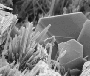 | Keywords: CaOH2SEM.jpg en Scanning electron microscopy image of fracture surfaces of hardened cement paste showing plates of calcium hydroxide and needles of ettringite micron scale http //www fhwa dot gov/publications/research/infrastructure/pavements/pccp/04150/chapt14 cfm US Department of Transportation PD-USGov Calcium compounds |