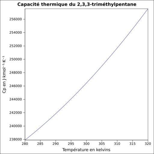 | Keywords: Capacité thermique 2,3,3-triméthylpentane.svg  fr Capacité thermique liquide calculée d'après <br/> Robert H Perry et Donald W Green Perry's Chemical Engineers' Handbook McGraw-Hill USA 1997 7e éd 2400 p ISBN 0-07-049841-5 p 2-170 own Epop 2010-06-28 Created with Gnumeric Heat capacity |