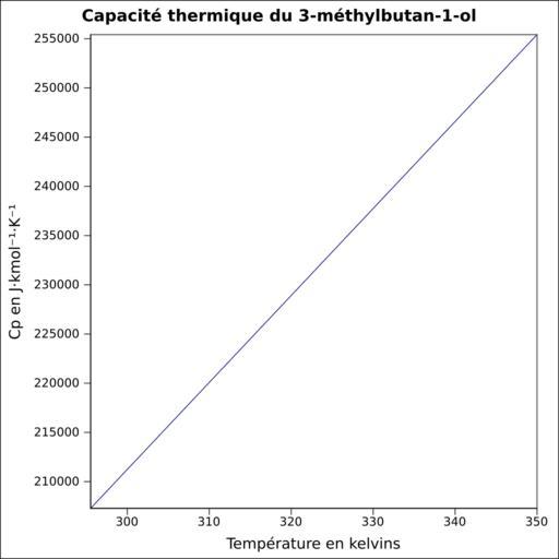 | Keywords: Capacité thermique 3-méthylbutan-1-ol.svg  fr Capacité thermique liquide calculée d'après <br/> Robert H Perry et Donald W Green Perry's Chemical Engineers' Handbook McGraw-Hill USA 1997 7e éd 2400 p ISBN 0-07-049841-5 p 2-170 own Epop 2010-06-28 Created with Gnumeric Heat capacity |
